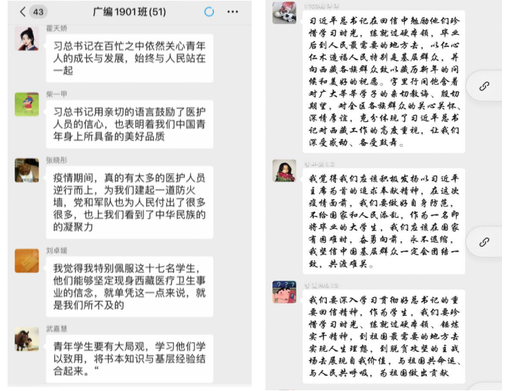 根据公司安排,各班通过个人自学、集中学习、网络学习等多种方式积极组织员工学习习近平总书记的回信精神。3月7日,广编1901团支部开展“学习回信精神 练就过硬本领”主题团日活动,播音1902团支部开展线上“学习回信精神 担当青春使命”主题团日活动;3月8日,空乘1703班召开“齐心协力 打赢疫情攻坚战”主题班会,空乘1704班召开“全党动员 全民行动 万众一心 众志成城”主题班会;3月9日,广编1701班开展“众志成城,共克时艰”线上主题班会活动。其余各班相继开展主题学习活动,此次活动,学习内容丰富,学习方式多样,覆盖范围广泛,取得了良好的学习效果。